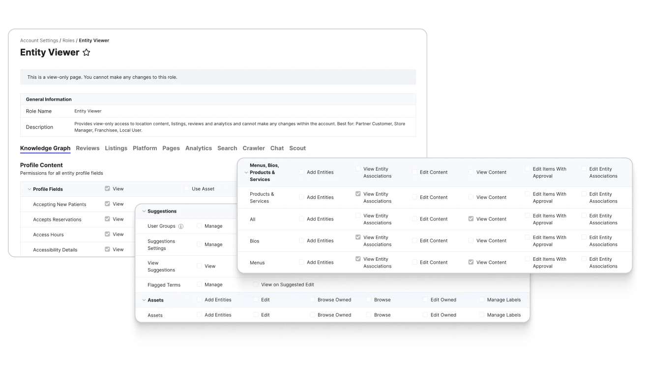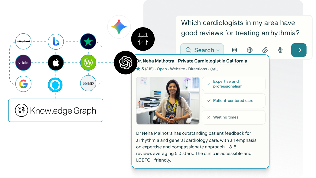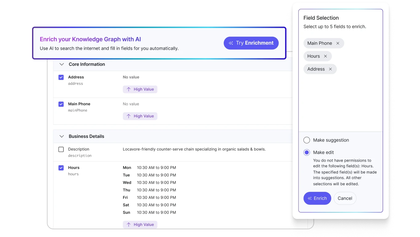Knowledge Graph内で一度更新するだけで、その変更は接続されているすべての場所に自動的に反映されます — リスト、ディレクトリ、ページ、レビューなど。これにより、サイロが排除され、手作業が削減され、すべてのチャネルにわたって精度が向上します。