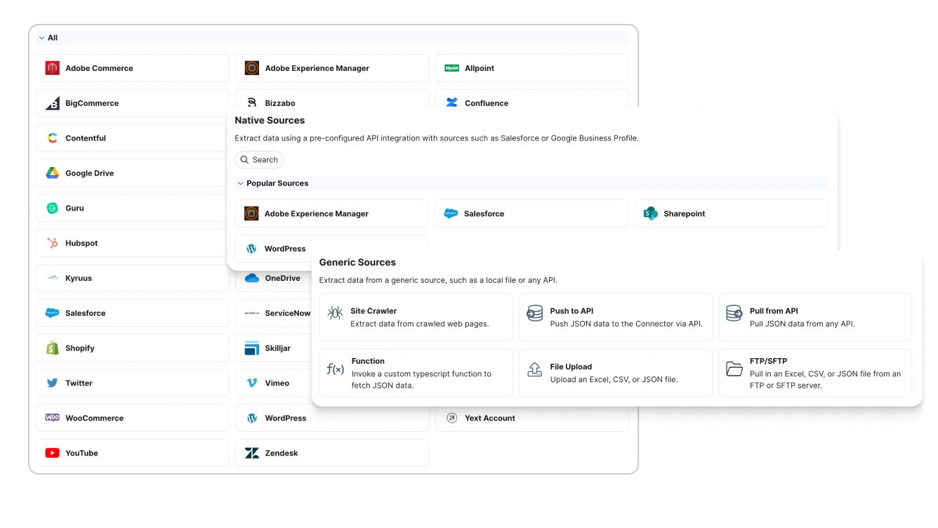 もちろんです。Yextコネクターは、事前構築されたアプリ、API、スプレッドシートのアップロード、自動化されたウェブサイトクロールを使用して、プラットフォームへのデータの出し入れを簡単にします。