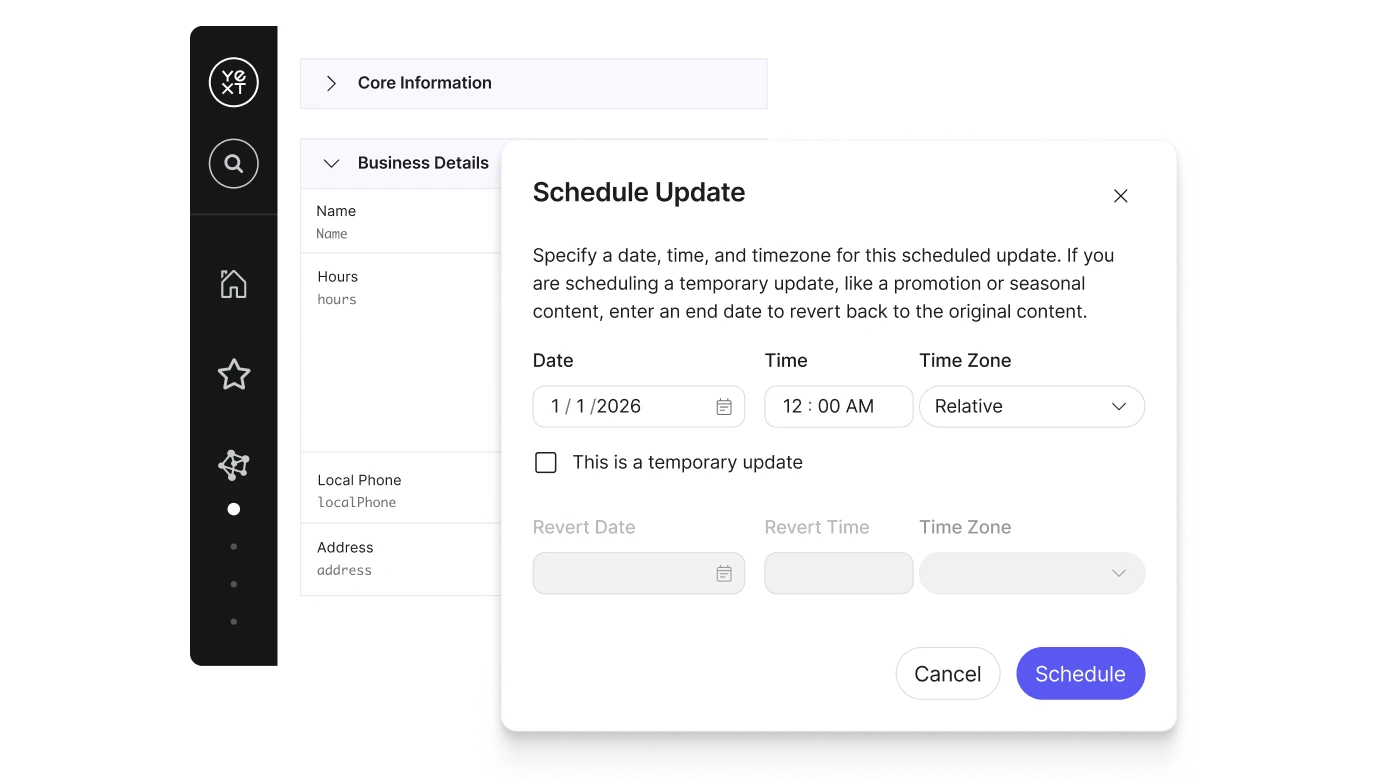 スケジュールされた更新を使用して、季節ごとの変更、プロモーション、ブランド変更、または場所の移動を自動化します。任意の日時に変更が行われるように設定することで、追加の手間をかけずに情報の正確性とタイムリーさを維持できます。