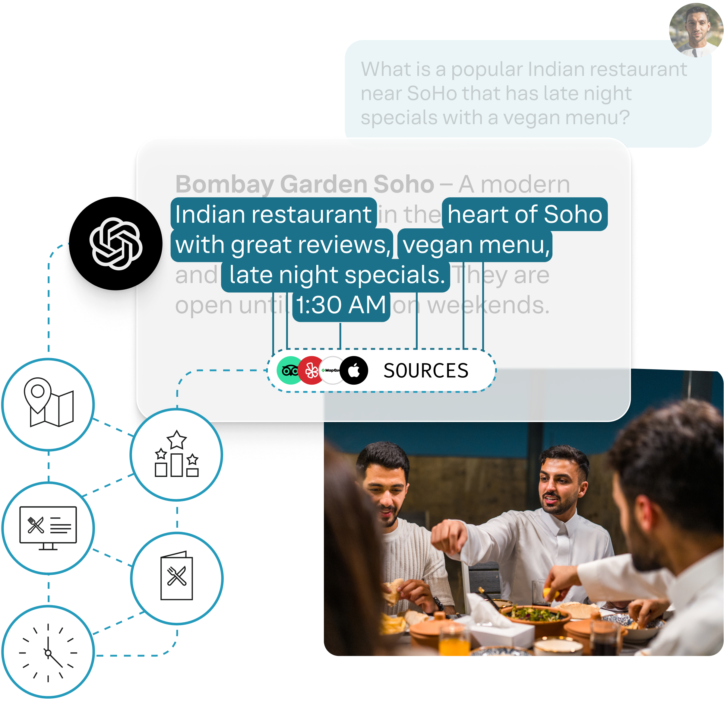 ChatGPTなどのAIエンジンや、それらが取得するすべてのソースに、構造化された信頼できる回答を直接提供します。AI対応データを使用すると、大規模言語モデル(LLM)がビジネスを確実に解析、グラウンディング、表現できるため、結果が生成される場所に関係なく、貴ブランドの情報が正確な回答で表示されるようになります。